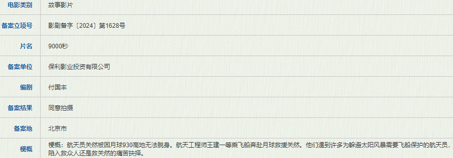 保利影业备案了付国丰编剧的《9000秒》,故事讲的是航天员关然被困月球930高地无法脱身。航天工程师王建一等乘飞船奔赴月球救援关然。他们遇到许多为躲避太阳风暴需要飞船保护的航天员,陷入救众人还是救关然的痛苦抉择。