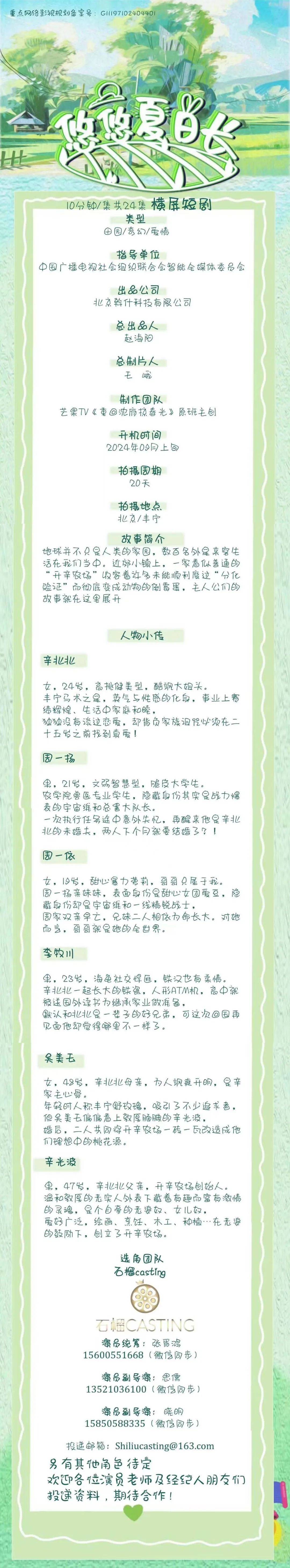 还有各个年龄段众多特约角色,欢迎各大经纪公司和演员老师踊跃投递资料。