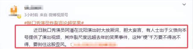 8月29号,八卦媒体收到了一则来自沈阳网友的曝料,主要内容便是来自脱口秀演员阿潘(阿pan)的一系列炸裂言论。