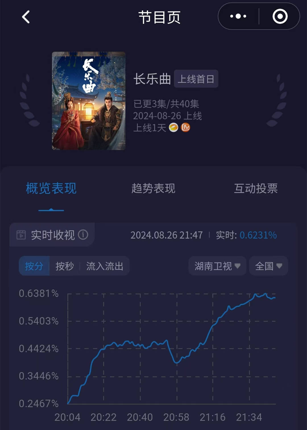 8月26日晚间,电视剧《长乐曲》在湖南卫视两集首播。这部电视剧由丁禹兮、邓恩熙主演,讲的则是古装架空环境当中,男女主角先婚后爱,并且一起查案子的故事。按理说,这种题材路数的电视剧,已经属于夕阳产业了,典型的老旧题材。但是,不看不知道,一看吓一跳,酷云实时的收视率显示,这部《长乐曲》的收视率起飞了。