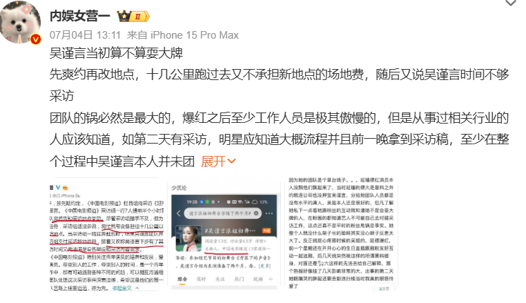 然而凭《廷禧》刚红没多久,吴谨言以及她的团队就被央视六公主点名为耍大牌,刚擅改时间、改地点,影响央视工作人员的工作。