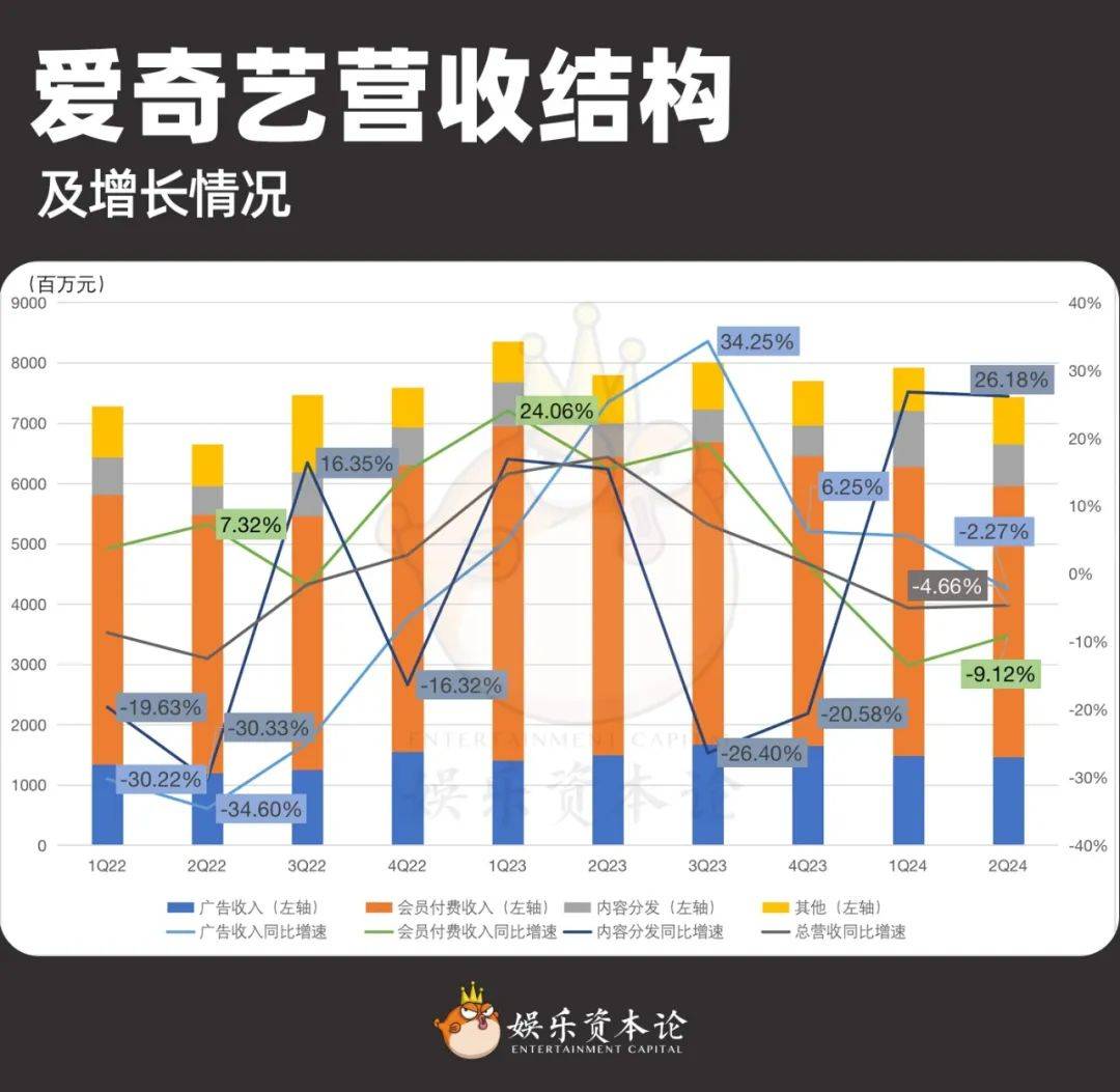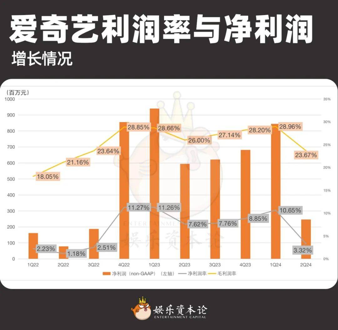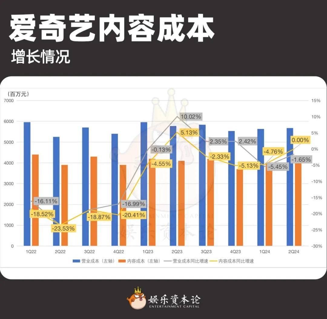 当成本不能继续压缩,营收的变动将以更大的倍数呈现在利润的变动上。第二季度,爱奇艺的会员收入和广告收入同比下降9%与2%。爱奇艺在业绩会上表示,爱奇艺的订阅会员具有一定的稳定基数,而波动主要来自被新的和流行的内容吸引的会员。