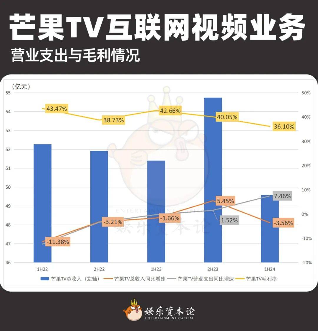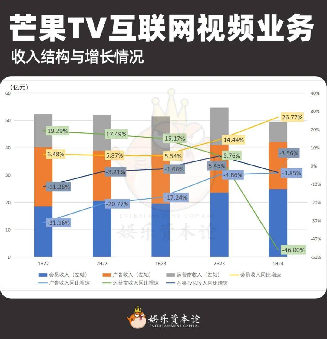 芒果方面,芒果超媒中芒果TV互联网视频业务主要由会员、广告、运营商三部分构成。2024上半年,广告收入同比下降3.85%,芒果TV总收入同比下降3.56%;会员收入表现相对亮眼,增长超26%。