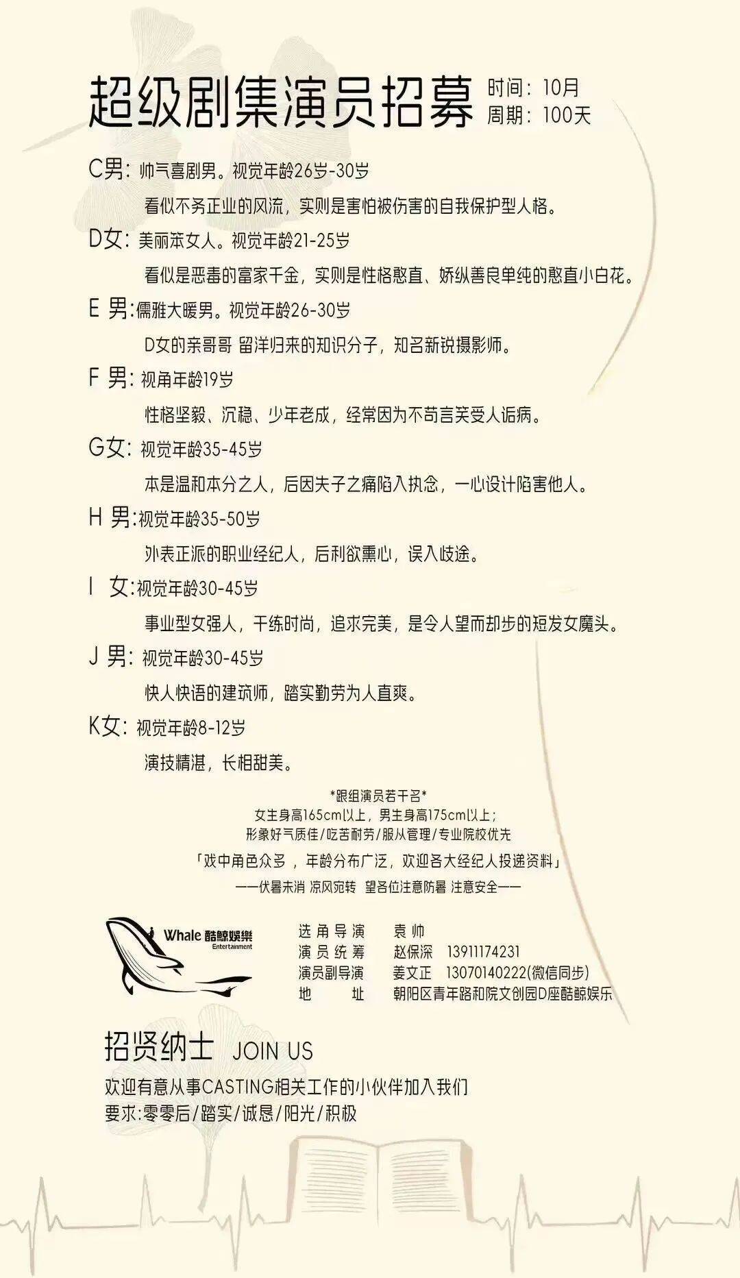 跟组演员若干名,女生身高165cm以上,男生身高175cm以上;形象好气质佳,吃苦耐劳,服从管理,专业院校优先。