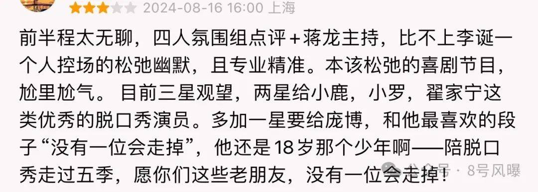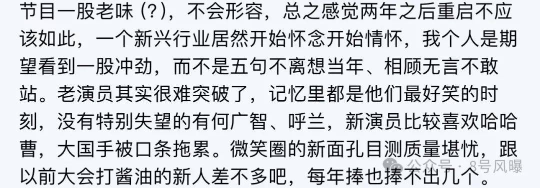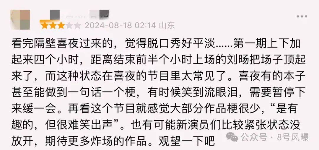 不仅如此,从内容方面来说,一些看完一期的观众表示,整期节目下来给人的感觉相对平淡,看了第一期上半场只有一个刘旸这样一个比较出彩的演员,还不如《喜人奇妙夜》的梗密集有趣。