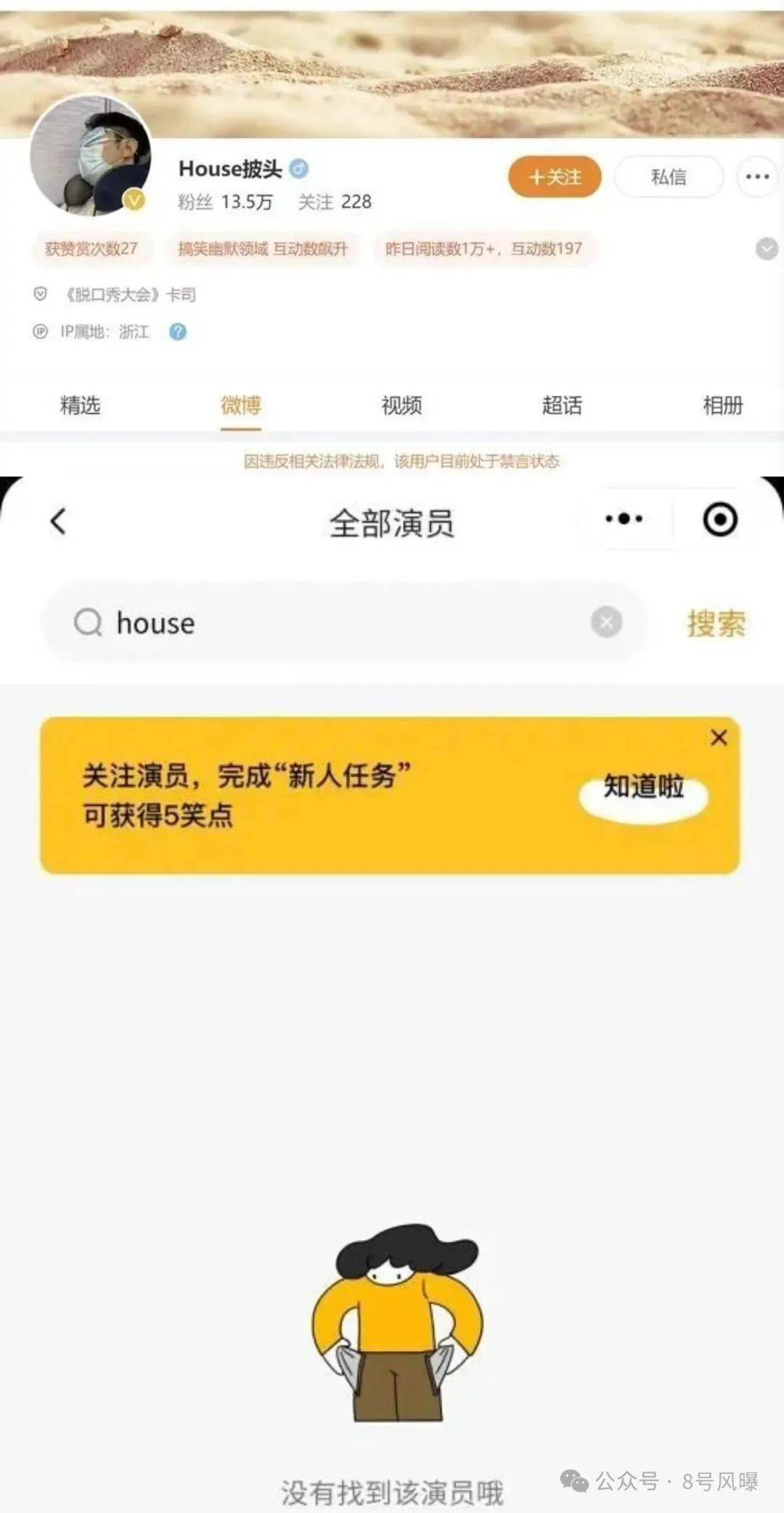 脱口秀演员House的个人微博账号先是被禁言,随后笑果各大官方账号还将他从演员名单中除名,之后的演出场次随即取消。