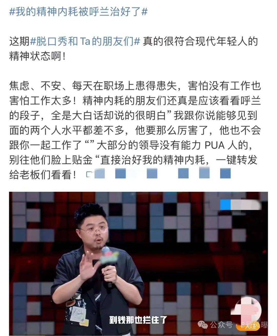 呼兰的段子也为大家所称赞,观众表示他紧贴现实话题进行了针对年轻人的表演,治好了打工人的精神内耗,具有人文关怀的意义,效果很不错。