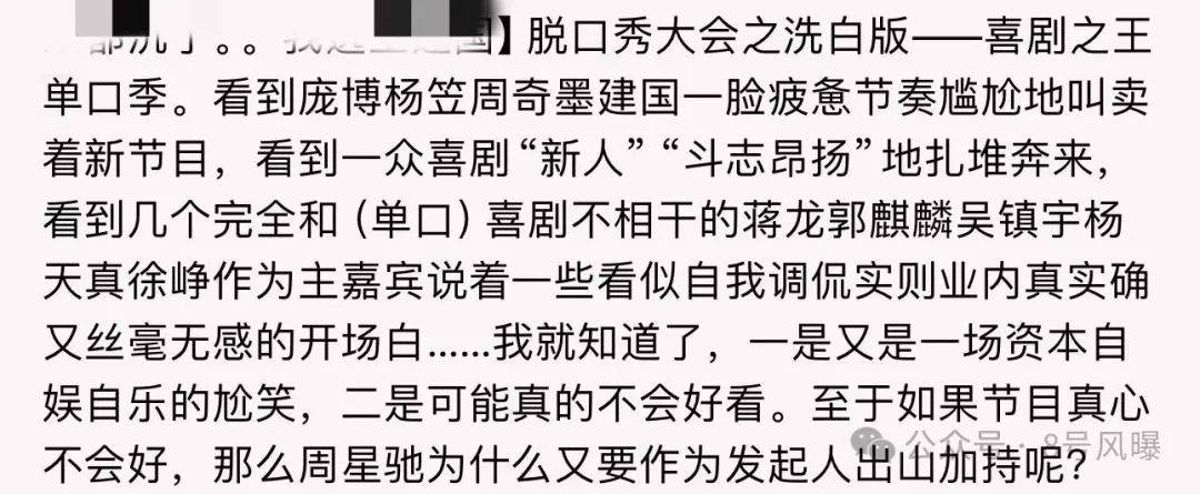 有一些观众对这档新节目提出意见,认为节目组就应该好好地做脱口秀,现在非要和喜剧之王和周星驰联动很牵强,没必要硬凹一个“新领域”。
