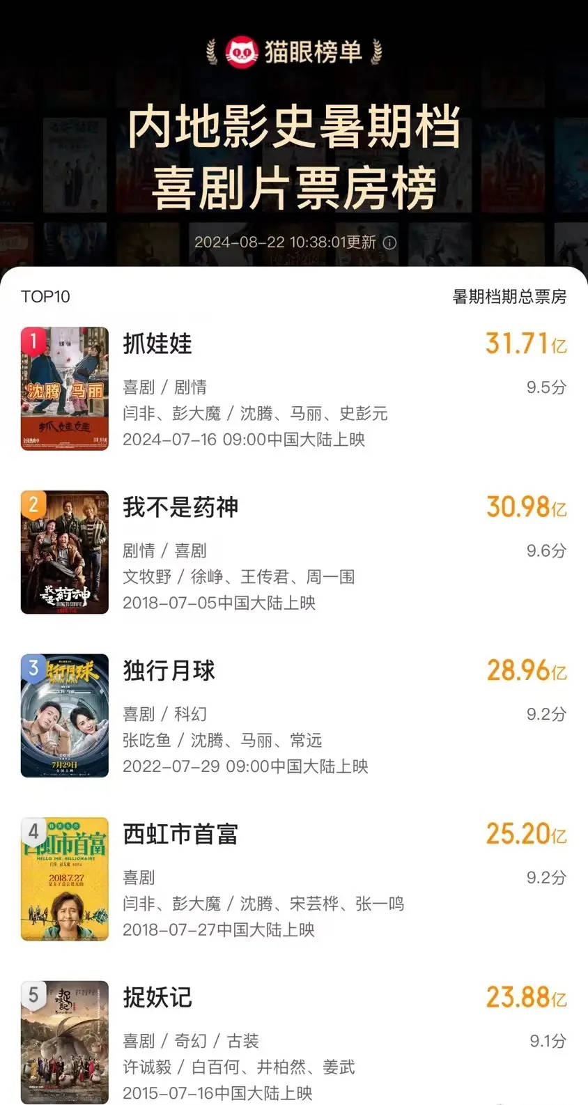 搜狐娱乐讯 据猫眼专业版数据,截至8月22日10时38分,电影《抓娃娃》累计票房破31.71亿,成影史暑期档喜剧片票房冠军!