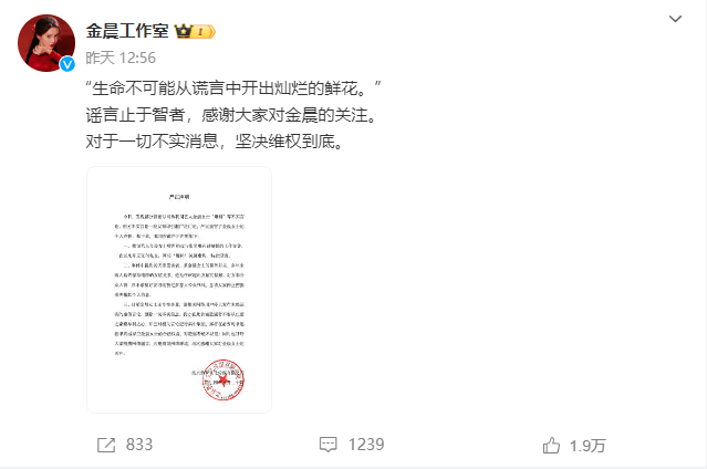 金晨工作室也是很快发出声明。