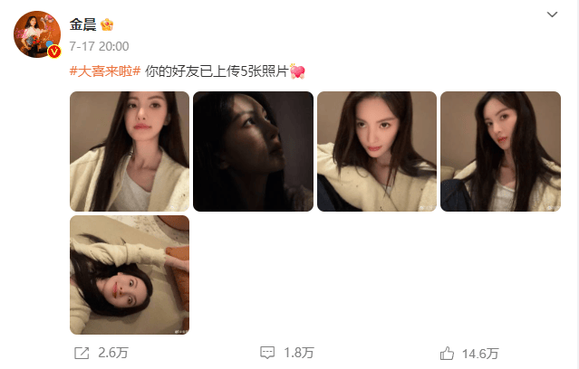 不过这几张自拍又像古力娜扎,又像姚晨,就是不太像金晨本人。