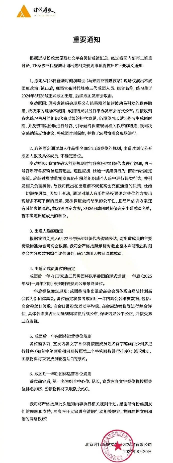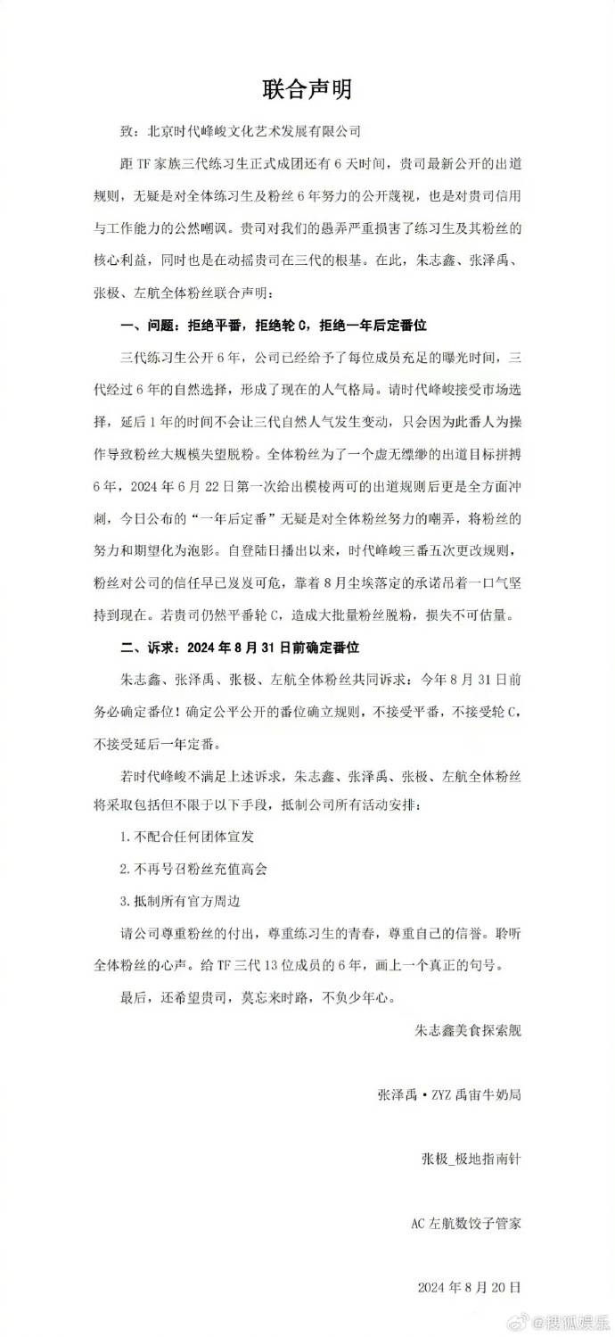 搜狐娱乐讯 8月21日,TF三代成员朱志鑫、张泽禹、张极、左航的粉丝发布联合声明,不满时代峰峻最新发布的出道规则,粉丝诉求包括拒绝平番、拒绝轮C、拒绝一年后定番位,2024年8月31日前确定番位。若时代峰峻不满上述诉求,粉丝不再配合任何团体宣发、不再号召粉丝充值高会、抵制所有官方周边。据悉,8月20日,时代峰峻官方发文称将保留成团时刻并不确定团员番位。