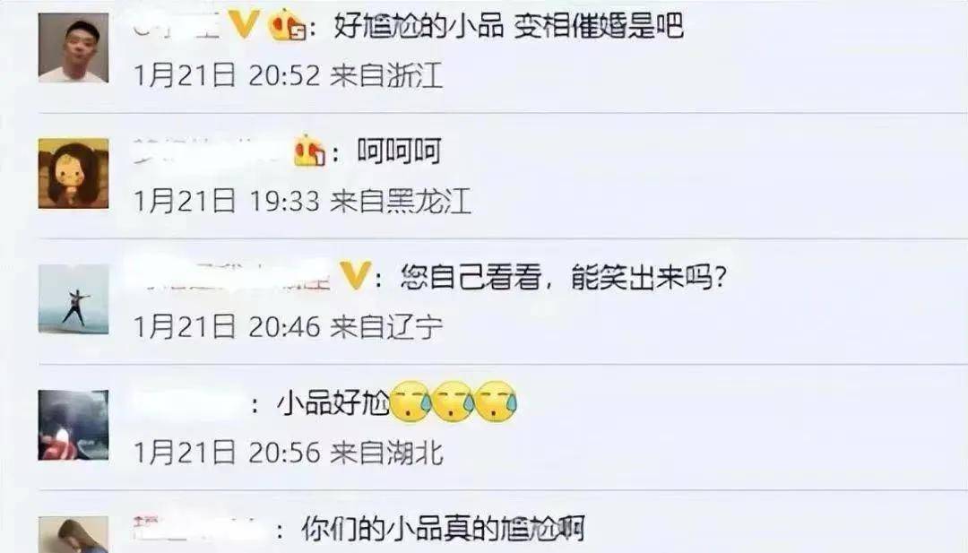 有人认为小品主题不好,是在对年轻人变相催婚。有人认为咋咋唬唬的太吵了。有人觉得看完小品尴尬的都扣出三室一厅了。总之就是清一色的差评。