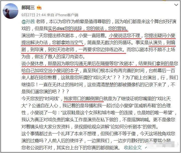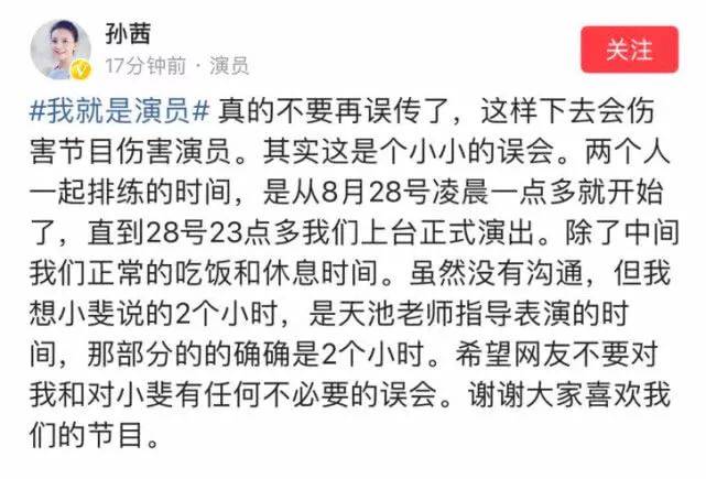四天后,孙茜专门捋出时间线,否认两人彩排时间仅有两小时的说法,并表示一切都是误会。