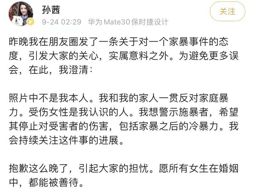 得知消息的粉丝和网友们纷纷前去留言关心她,却得到了她了否认。24日凌晨,孙茜发文澄清了此事,表示自己只是在朋友圈发表了一下对家暴的态度没想到引起了大家的误会。