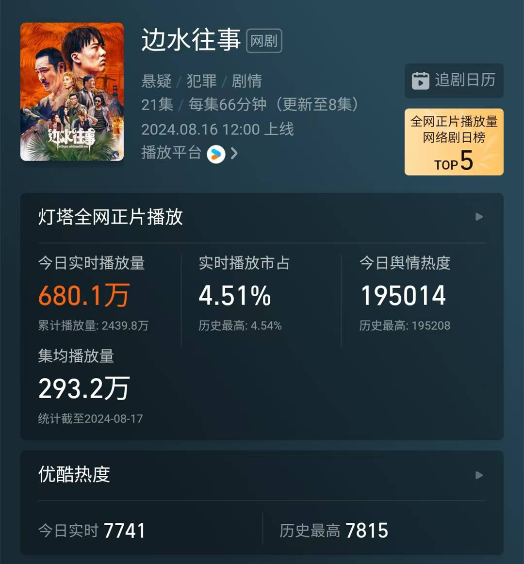 资料平台的讯息显示,这部《边水往事》是16集的剧情。这意味着,18日晚间,随着第7集和第8集的放出,该剧即将实现播出过半。在半数剧情已经放出的情况之下,该剧未能实现口碑上的火爆,那么,接下来,等待它的,可能便是扑街的命运了。