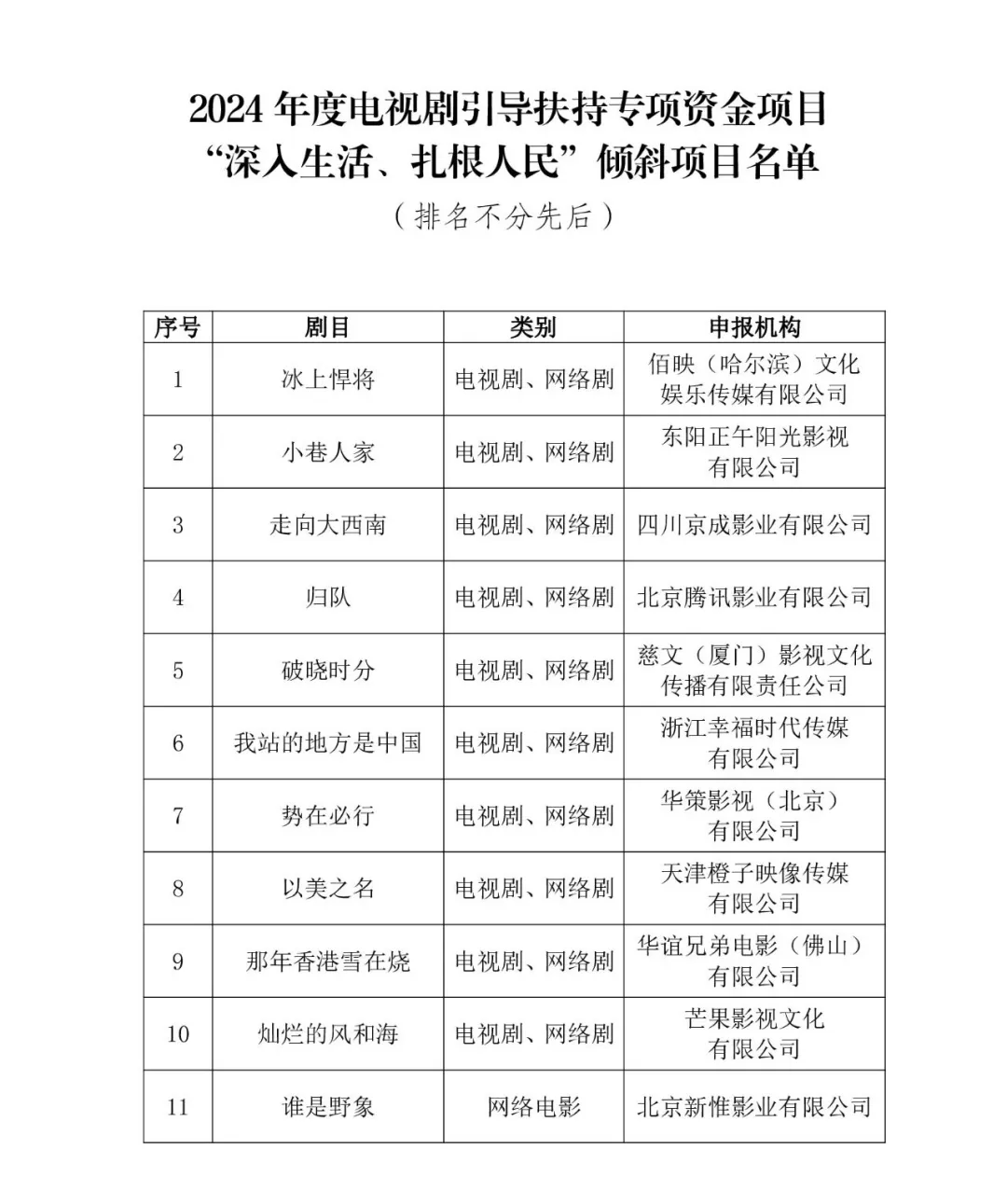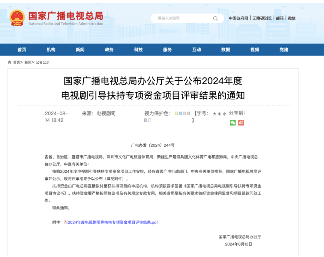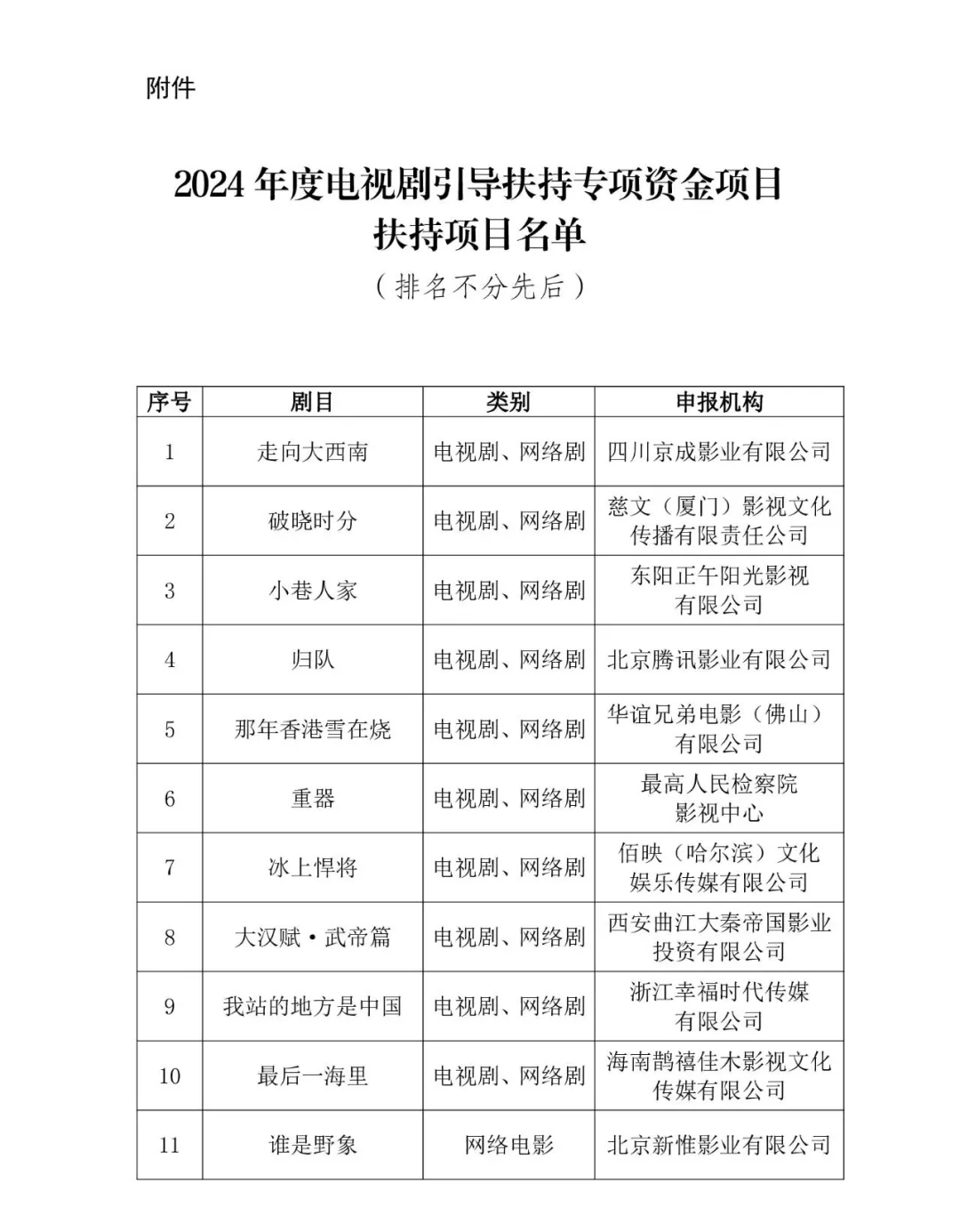 按照2024年度电视剧引导扶持专项资金项目工作安排,经各省级广电行政部门、中央有关单位推荐,国家广播电视总局评审并公示,现将评审结果予以公布。