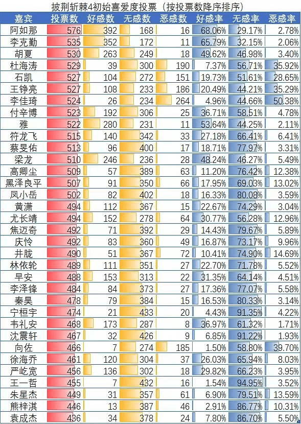 另有豆瓣网友自发统计了《披荆斩棘4》的初始喜爱度投票,包括好感数、无感数、恶感数等指标。其中阿如那好感率最高达68.06%,李克勤以65.79%位居第二,雅以53.64%排在第三,而李佳琦则以50.38%的“恶感率”位列第一。