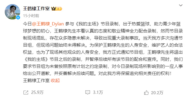 搜狐娱乐讯 8月14日,王鹤棣在录制综艺《我的主场》时被粉丝疯狂围堵,现场秩序混乱,工作室发文宣布退出《我的主场》录制。8月15日,有网友透露王鹤棣在录制时被抓伤了手和脖子。对此,王鹤棣粉丝方发文辟谣:“经与对接沟通,网传棣棣受伤为不实消息,棣棣没有受伤,请兄棣伙们放心!