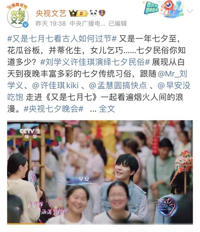 8月10日七夕节,早安亮相在中央广播电视总台综合频道(CCTV-1)、综艺频道(CCTV-3)、音乐频道(CCTV-15)、央视频等平台播出的《如七而遇 漫歌今夕——2024年中央广播电视总台七夕特别节目》。晚会开场合作曲《又是七月七》,早安将年轻人喜爱的潮流说唱元素融入民俗文化,演绎中国式浪漫。之后一首《Pillow》营造出清新甜蜜的爱情氛围,唱出拨动心弦的恋人絮语。