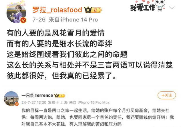 “巴拉拉能量”的风波,起源于罗拉发布的一条emo微博。她表示有的人要的是风花雪月的爱情,而有的人要的是细水长流的牵绊,直言“我真的已经累了”。言语间透露出自己渴望婚姻,而王能能只想停留在浪漫的恋爱阶段。有粉丝在评论区劝她何必在乎那一张纸,罗拉直白地回复道:“但生活不可能是我一直租房在这里等着他来恋爱,说的太轻松了”。