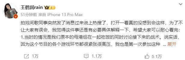 9日,李雪琴在《十天之后回到现实》节目中被孤立引发热议,其中王鹤润的表现引发网友不满。随后,王鹤润发长文回应此事,称“嘘的动作绝对没有任何针对性和指向性”,本意并非如此只是精神过度紧张,并且节目会有一些删减,衔接效果令人产生误解。她表示大家都是在认真玩游戏,希望大家能理性看待。