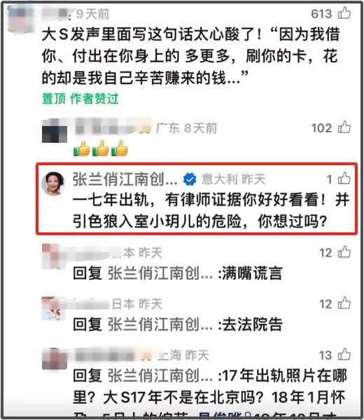 有网友在张兰的评论区留言表示同情大S,认为她在婚姻里付出很多,有关钱的问题也应该按照离婚协议,怎么签就怎么来。随后张兰在评论区怒怼网友,称(大S)17年就出轨了,有律师证据。还称大S引狼入室,让大家想一下小玥儿的危险。