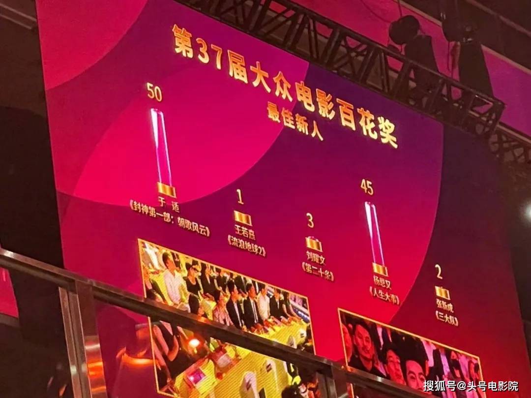 最佳新人奖于适(《封神第一部:朝歌风云》)50票获奖,小姑娘杨恩又(《人生大事》)45票,其他几位刘耀文(《第二十条》)3票,张新成(《三大队》)2票,王若熹(《流浪地球2》)1票,和前两位相差甚远。