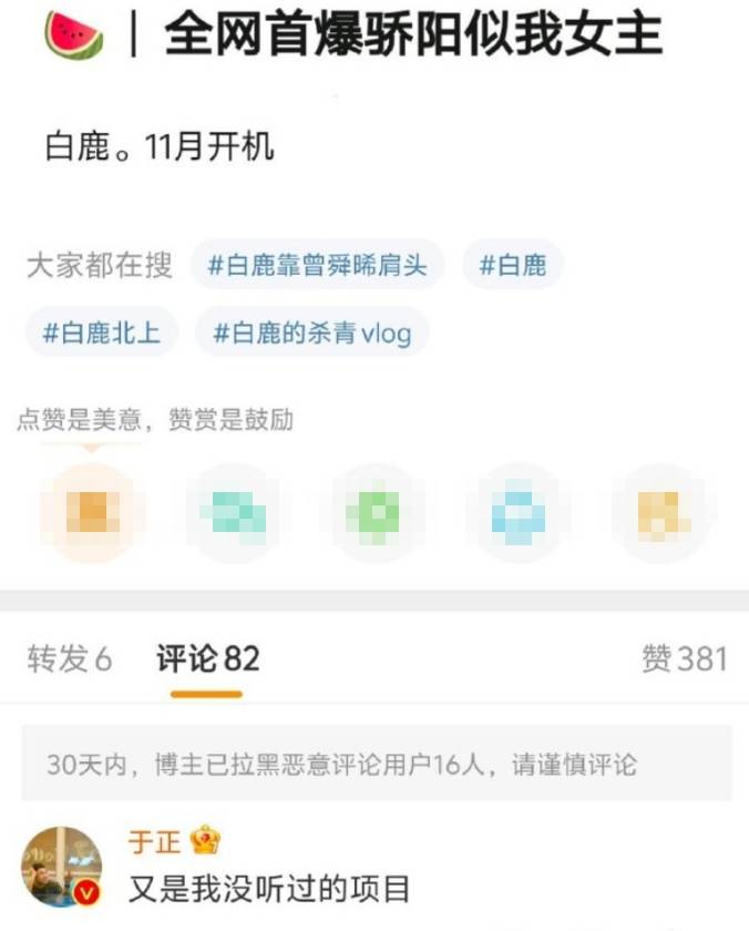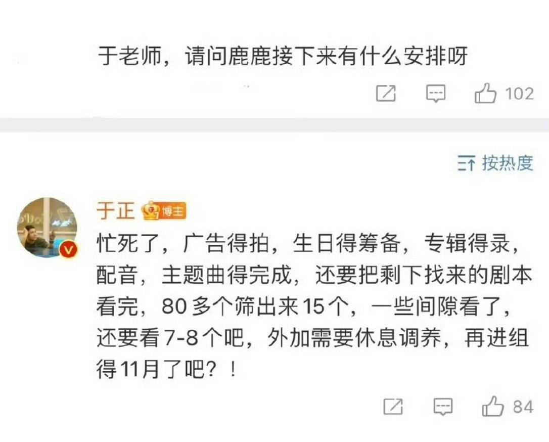 此前,于正曾透露白鹿接下来的行程,称白鹿正在看剧本,已经从80多个筛到15个,预计11月进组。