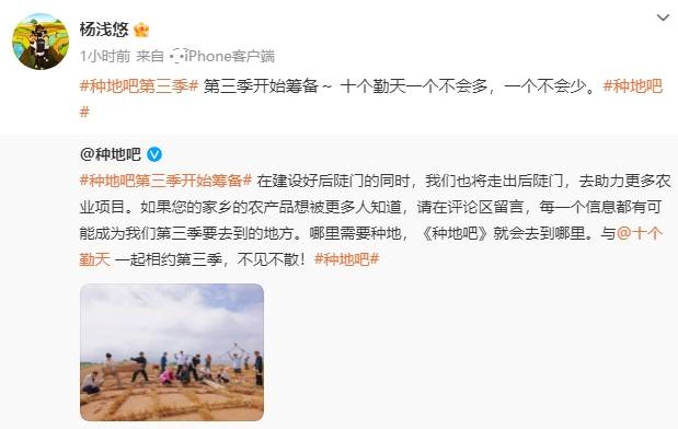 搜狐娱乐讯 7日,《种地吧》官方账号在社交平台上发文称已开始筹备第三季,随后节目总导演杨长岭转发并表示:“第三季开始筹备~十个勤天一个不会多,一个不会少。”