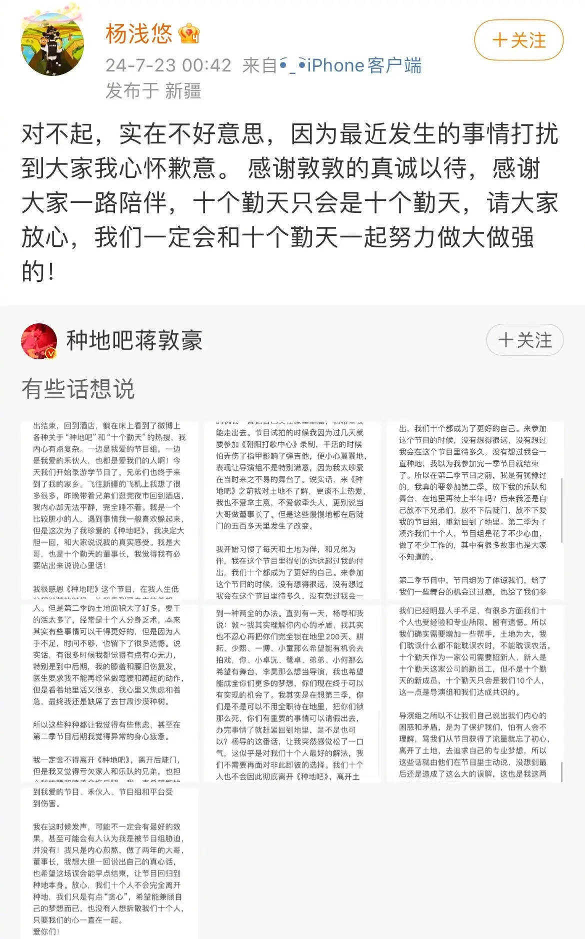 7月23日,《种地吧》导演就近期引发的争议道歉:“感谢敦敦的真诚以待,感谢大家一路陪伴,十个勤天只会是十个勤天。”