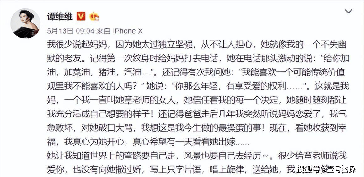 本文信源来自权威报道【长沙晚报】【新浪娱乐】【谭维维微博】(详细信源附在文章末尾)。为提升文章可读性,细节可能存在润色,请理智阅读,仅供参考!谭维维恋爱后才明白母亲的痛苦