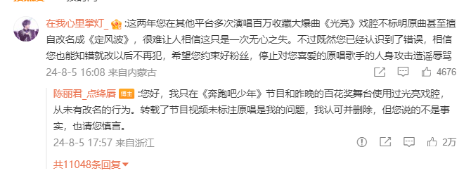 另外有周深的粉丝质疑陈丽君,称其这两年多次演唱大爆曲《光亮》戏腔,并且不标注原唱甚至擅自改名的事情。对此陈丽君回应: “我只在《奔跑吧少年》节目和昨晚的百花奖舞台使用过光亮戏腔,从未有改名的行为。转载了节目视频未标注原唱是我的问题,我认可并删除,但您说的不是事实,也请您慎言。”