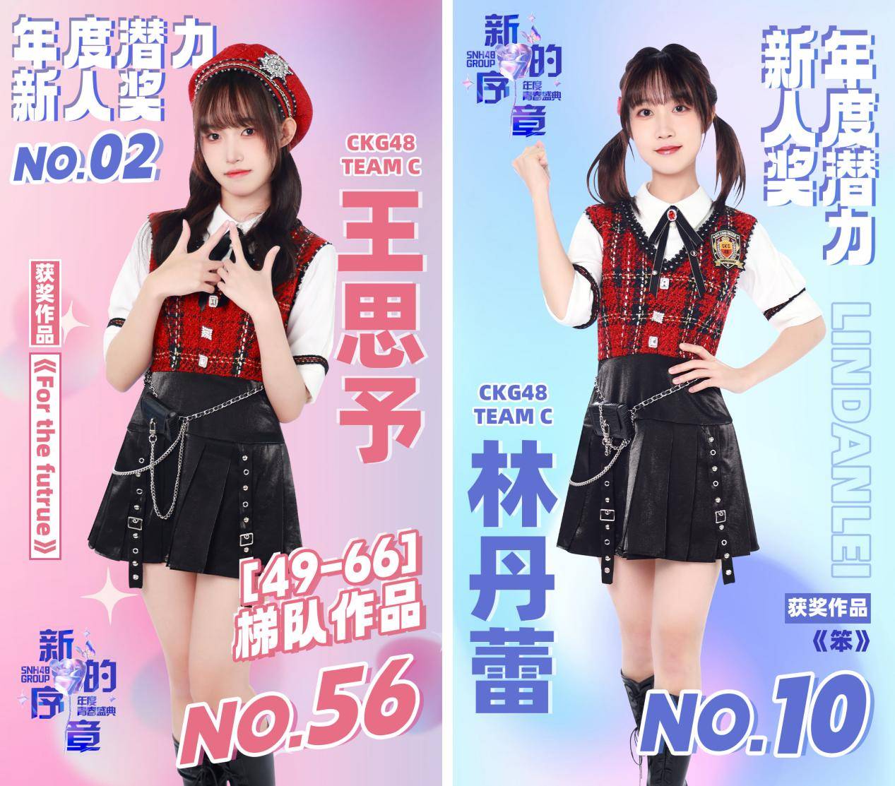 在“SNH48 GROUP年度潜力新人”奖项的评定中,CKG48 TEAM C王思予的作品《For the future》荣获新人奖第二名;CKG48 TEAM C林丹蕾的作品《笨》荣获新人奖的第十名。盛景可望,乘风破浪,她们挥洒汗水与热血,让大家看到了她们的成长。自信坚毅,迎风起航,未来的她们定会更加精彩,用自己的努力画出更美丽的画卷!