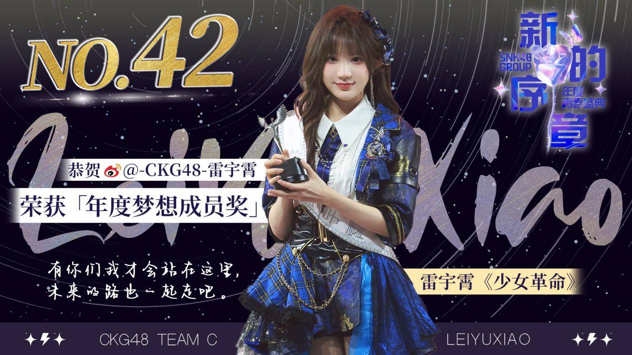 在“SNH48 GROUP年度梦想成员”奖项的评定中,CKG48 Team C雷宇霄的作品《少女革命》荣获第四十二名,作为CKG48一期生的她,突破自我,砥砺向前,用汗水和坚持完美诠释了自己的梦想;永不放弃、坚定向前,故事的结局由她亲自书写。“这一次不是想要,而是一定要得到。”雷宇霄在她青春时刻的坚定发言此刻已成为了她全新篇章的起点,她将向着更好的未来前进,拥抱属于自己的光芒!同时她也表示希望自己能够让更多的人知道她的名字,知道CKG48的名字,与CKG48成员们携手并肩、迎风蜕变,向更高更远的地方展翅飞翔。