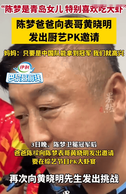 搜狐娱乐讯 北京时间8月3日晚间,巴黎奥运会乒乓球女单上演巅峰对决,中国选手孙颖莎和陈梦争夺金牌,最终,陈梦以4:2战胜孙颖莎,成功卫冕,成为国乒队史第三位奥运女单双冠王!这也是中国代表团在本届奥运会上获得的第14枚金牌。陈梦表哥黄晓明接受采访时表示,“两个人都很棒,梦梦沉得住气~骄傲”,陈梦爸爸也表示,“陈梦是青岛女儿,特别喜欢吃大虾”,陈爸爸向黄晓明发出邀约,要在综艺节目《中餐厅》中PK大虾宴。