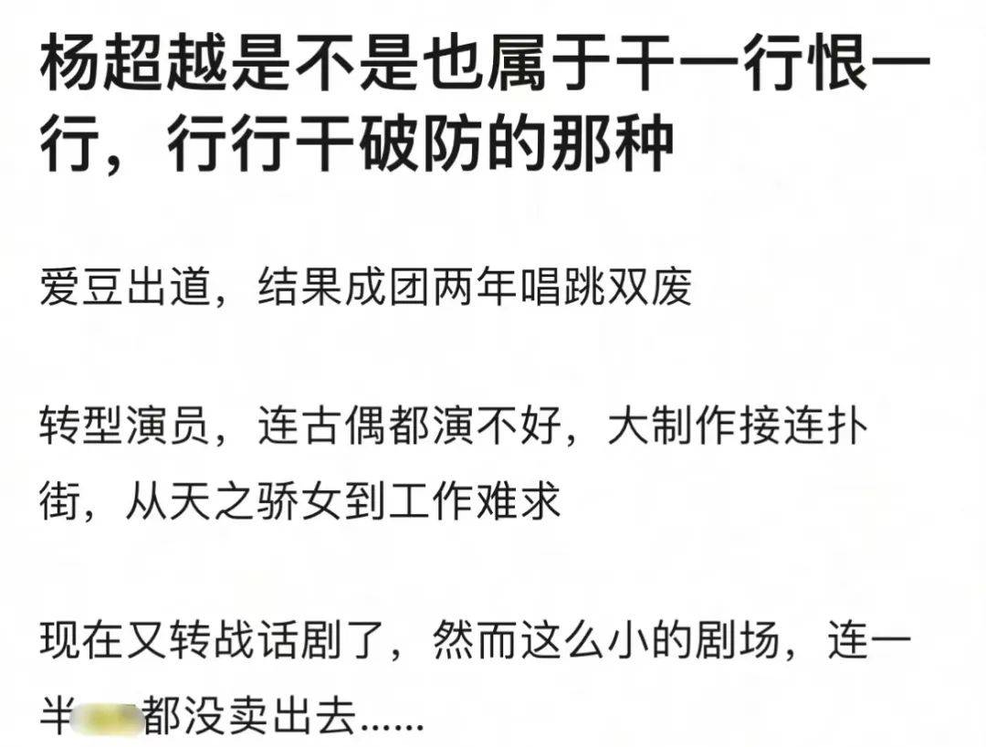 新剧扑街对杨超越事业发展有很大影响,她后来转去演话剧,形势依旧不太乐观。