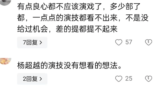 加上她主演的两部新剧,《重紫》和《七时吉祥》播出,收视和口碑都不乐观,杨超越在剧里仪态差,五官乱飞,演技遭到了群嘲。