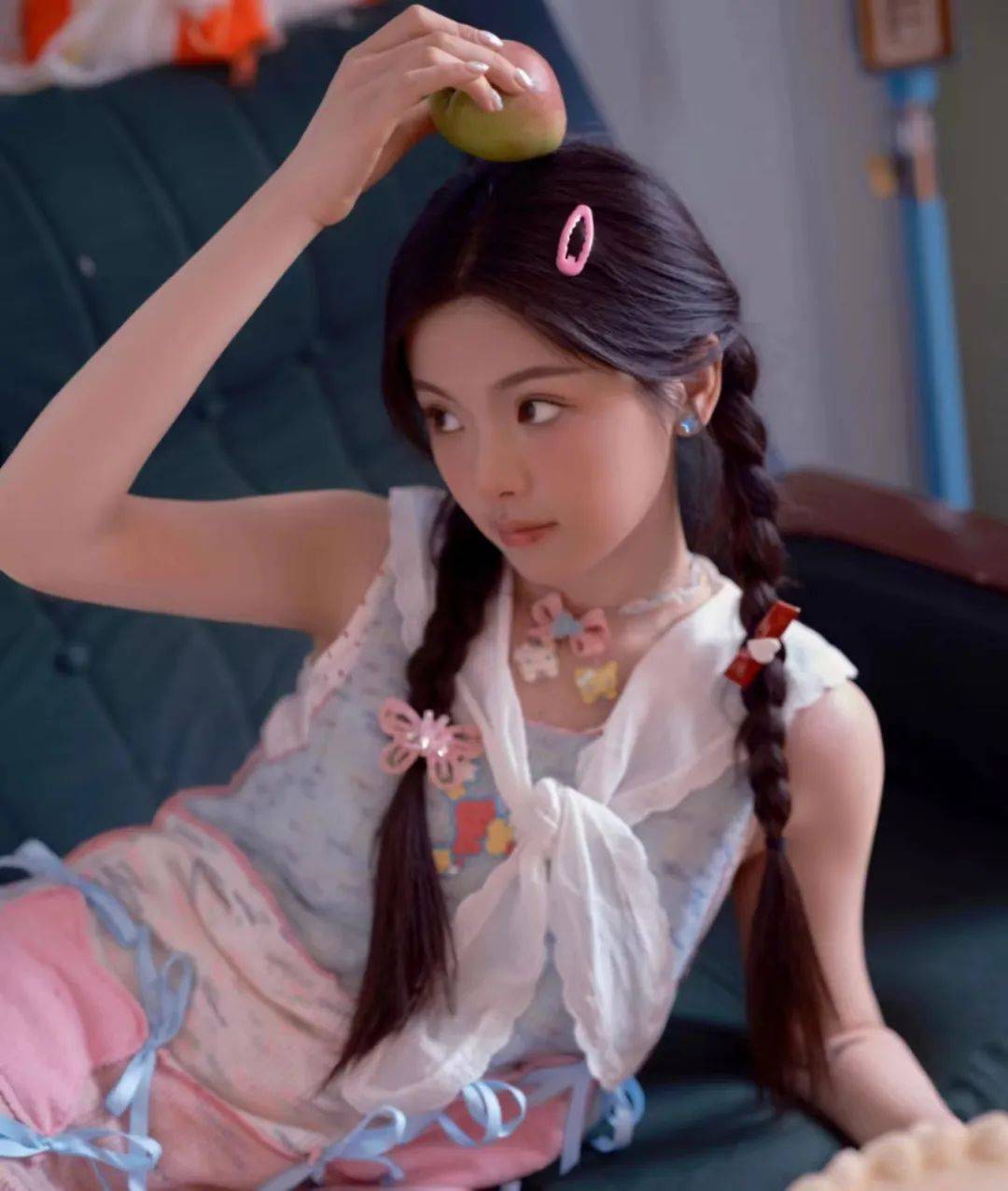 照片中杨超越留着麻花辫,戴着粉色的夹子,做着各种可爱的动作,整个人显得古灵精怪、元气满满,很有少女感。