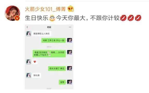 傅菁晒出聊天记录,留言称杨超越生日,她最大,不跟她计较。