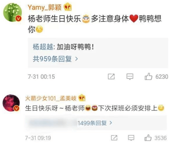 郭颖称呼杨超越为老师,并提醒她多注意身体,她如今也是默不作声。同样称呼“杨老师”的还有孟美岐,她留言称下次会把探班安排上。