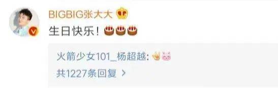 张大大的评论言简意赅,一句“生日快乐”简洁明了,杨超越的回复很有趣,两个表情包幽默搞笑。