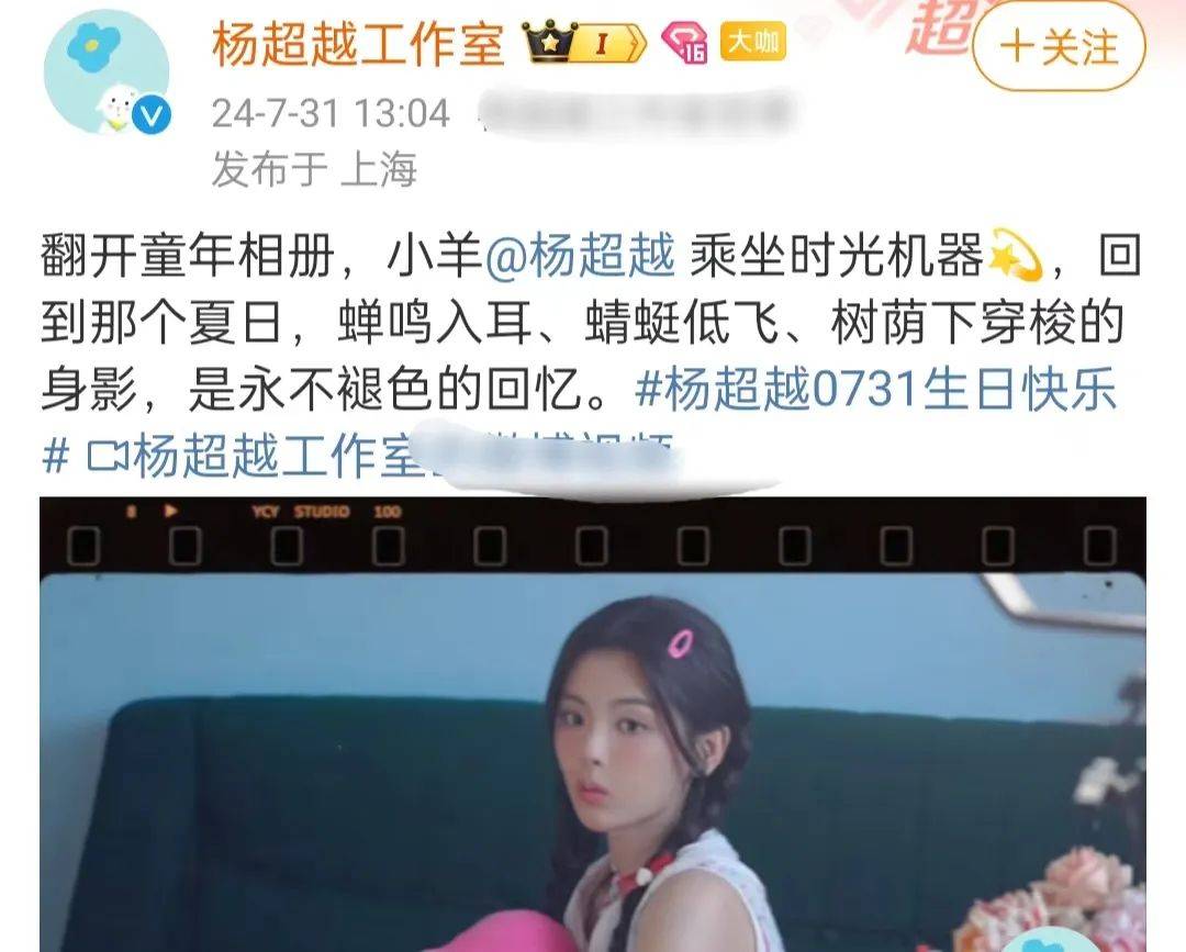 杨超越工作室分享了一则视频,视频是杨超越拍摄生日写真的花絮,工作室第一时间为其送上祝福。