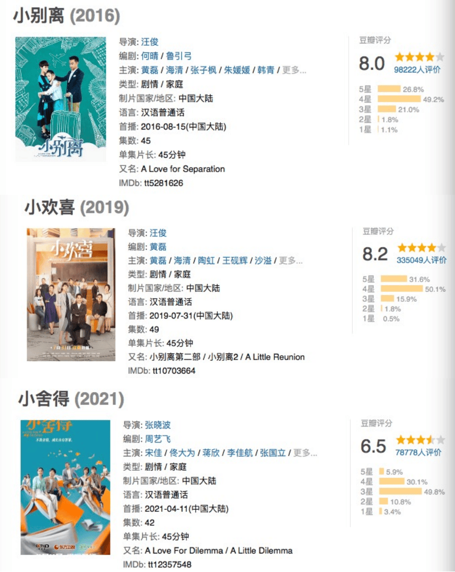 又如“小系列三部曲”中的《小舍得》与两部前作相比口碑大幅下滑,豆瓣评分从此前的8分 跌到了如今的6.5分,而“贩卖焦虑”是其受到诟病最多的一点,剧中的多处转折都是为了制造矛盾而矛盾,随后又刻意营造出美好的假象,在生活气上亦有所欠缺,难以让人信服。