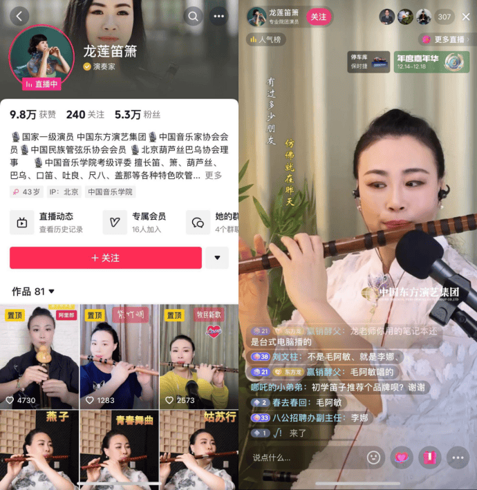 国家一级演员龙莲是此次“东方有新艺”活动的评委,同时也是中国东方演艺集团的院团主播。一年前刚试水直播时,她直播间观众只有个位数,不知道该怎么在直播间互动。带着困惑,她坚持参加“艺播计划-抖音直播院团专项”的培训,下播后做复盘,如今一场直播观看人数有两三万,每月还能有近万元的礼物收入。龙莲表示,相比打赏,直播更重要的是拉近了她与观众的距离,锻炼了她的个人能力。直播中培养的互动能力,让她在线下参与百姓大舞台公益演出时更能调动观众情绪,收获了自己现场氛围最好的一段表演。
