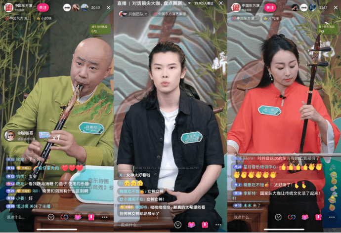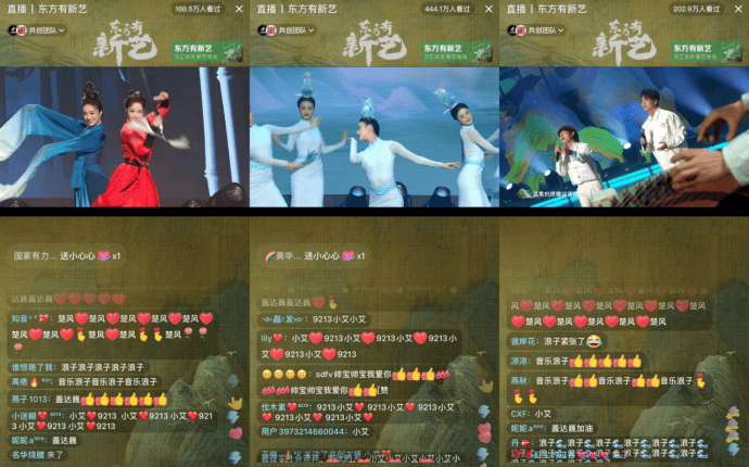 今年6月,中国东方演艺集团联合抖音直播发起“东方有新艺”线上内容大赛,由《唯我青白》《大江东去》《江山竞秀》《只此青绿》剧目主创人员等担任评委,选拔声乐、器乐、舞蹈赛道的优秀抖音主播。活动吸引了4万名抖音才艺主播参与,活动话题#东方有新艺 在抖音播放量超2.7亿次。