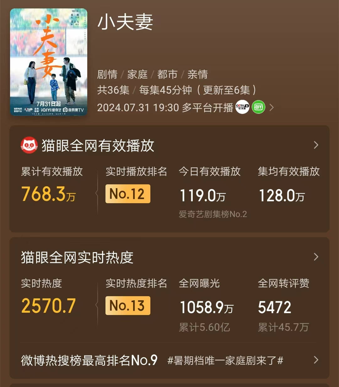 我们再来看看《小夫妻》的网络成绩。猫眼专业版的数据显示,8月2日早间,《小夫妻》的热度排名是第13名,尚且不如早就完结的《错位》,不如被群嘲扑街的《颜心记》等等。在热度排名当中,已经上线56天的《玫瑰的故事》都比它热度值高。一部正在上升期的电视剧,播出状态之下,热度值打不过老剧,确实不应该。