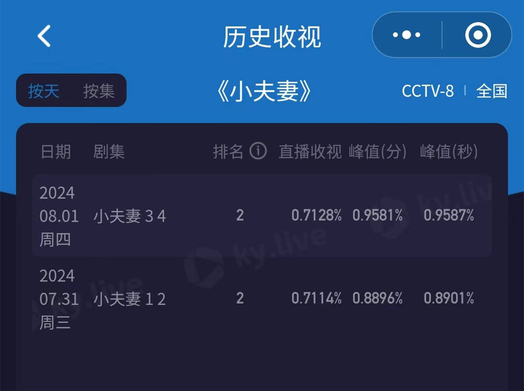 先来看看酷云开出的收视率数据。该剧首日的收视率是0.7114%,次日的收视率是0.7128%。这个成绩,放在央八今年以来的成绩单当中,基本上可以视为是垫底型的选手了。早前,黄晓明主演的电视剧《赤热》央八播出,因为收视率无法破1%,而被群嘲,认为是央八今年以来的最低成绩,跌破底盘了。而这一次,《小夫妻》的成绩,还不如《赤热》呢,这就更尴尬了。
