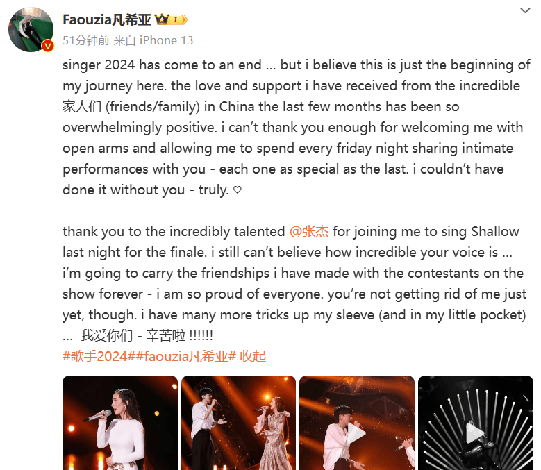她表示,虽然《歌手2024》已经落下了帷幕,但是自己也很感激这个机会,也很爱自己的粉丝,粉丝们都辛苦了,似乎也是想用这个方式来平息舆论。