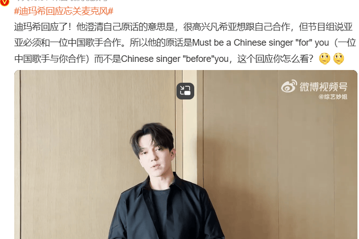 当时他那句话大致就是说,自己想跟凡希亚合作,但是节目组告诉他,凡希亚要跟中国歌手合作,所以他没有机会了。